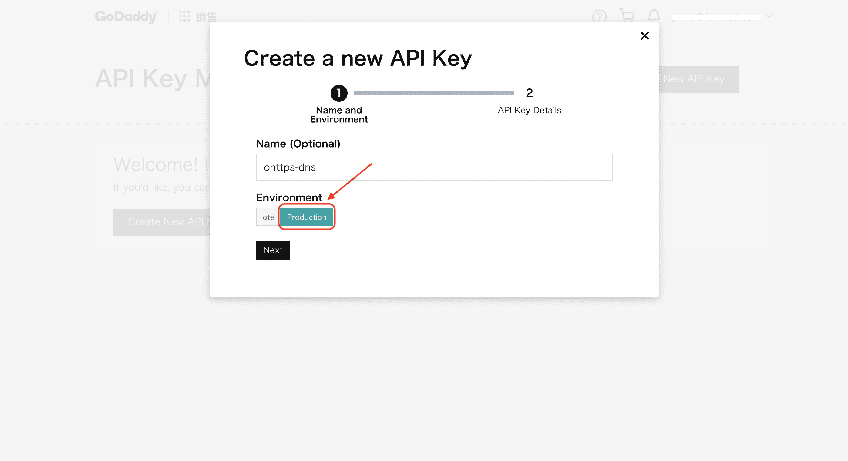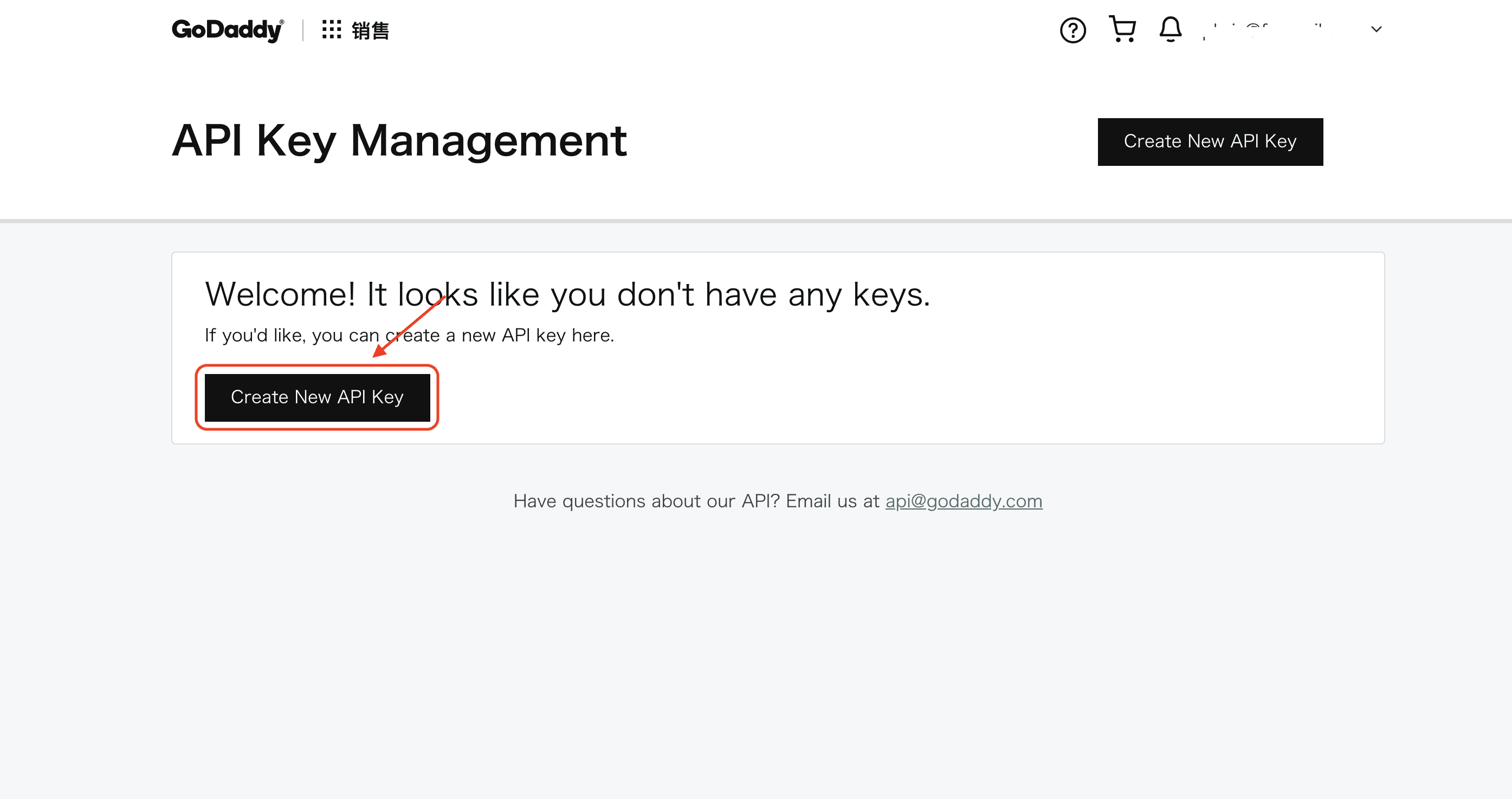 Click [API Keys] to enter API Key Management: https://developer.godaddy.com/keys/