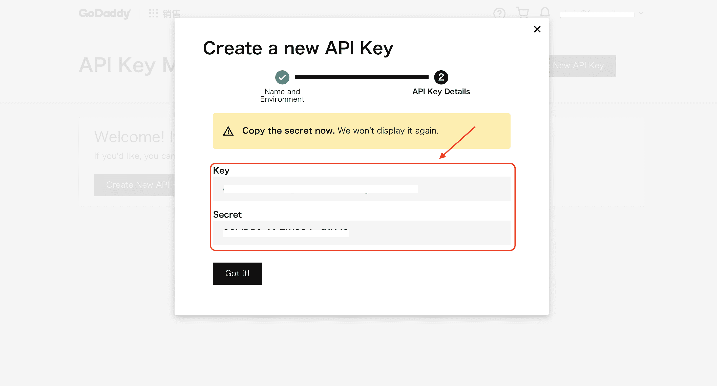 The Key and Secret saved in step 5 are the content that needs to be filled in when adding [DNS Authorization-GoDaddy] in CertOne.